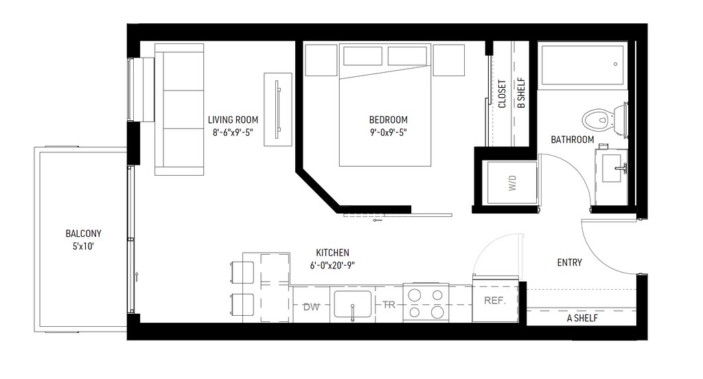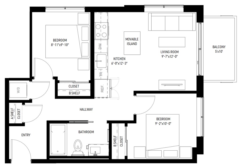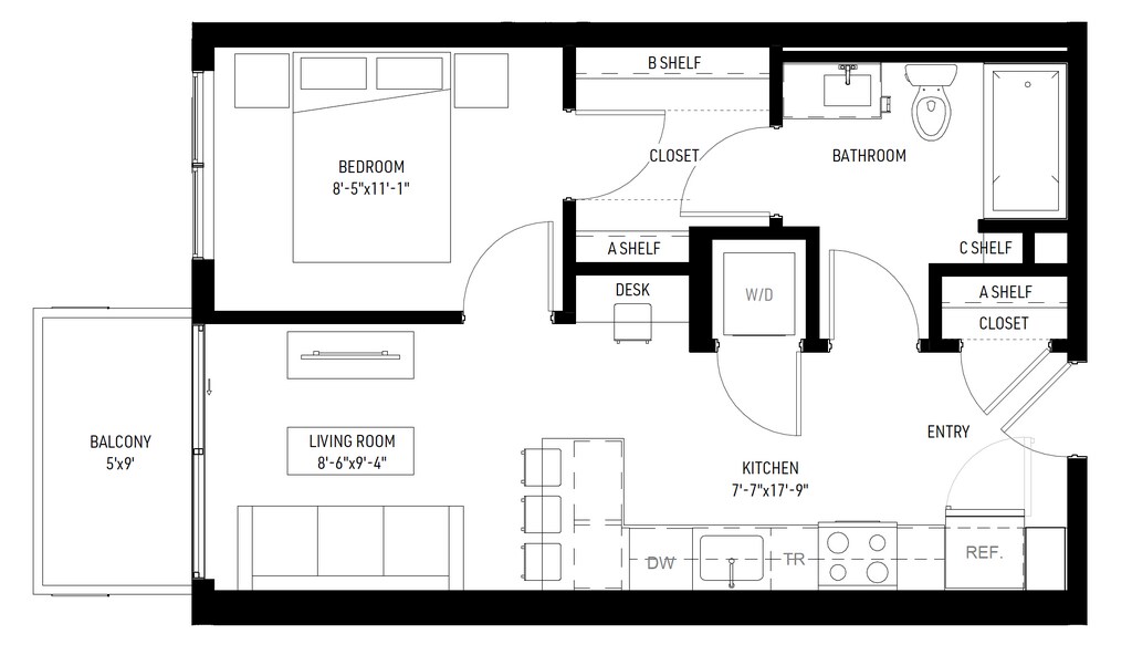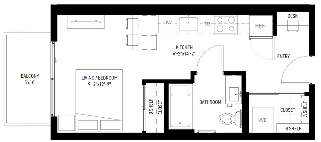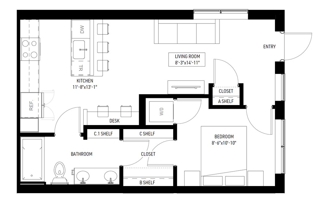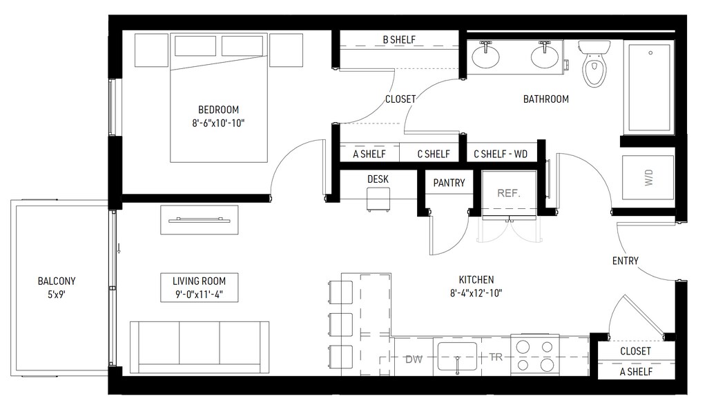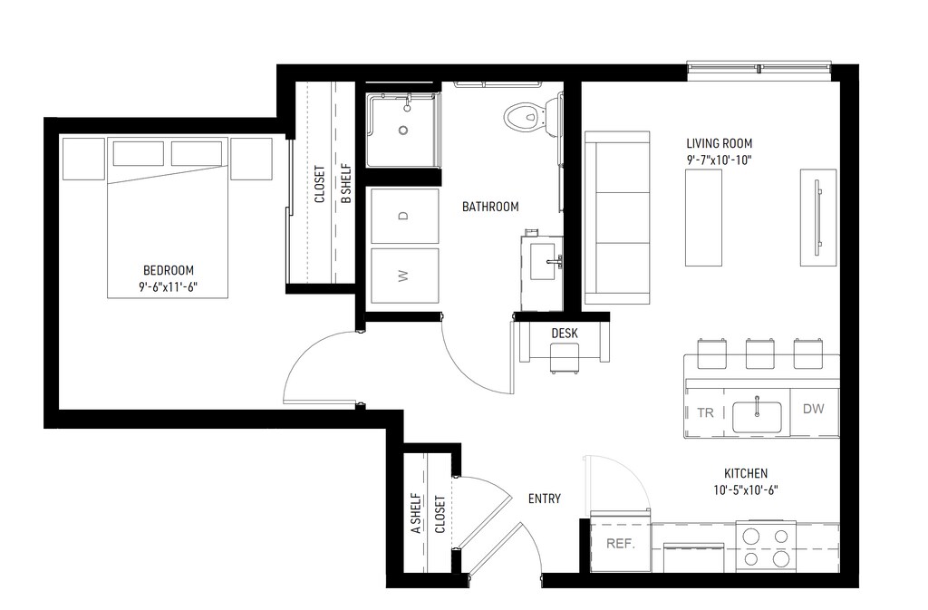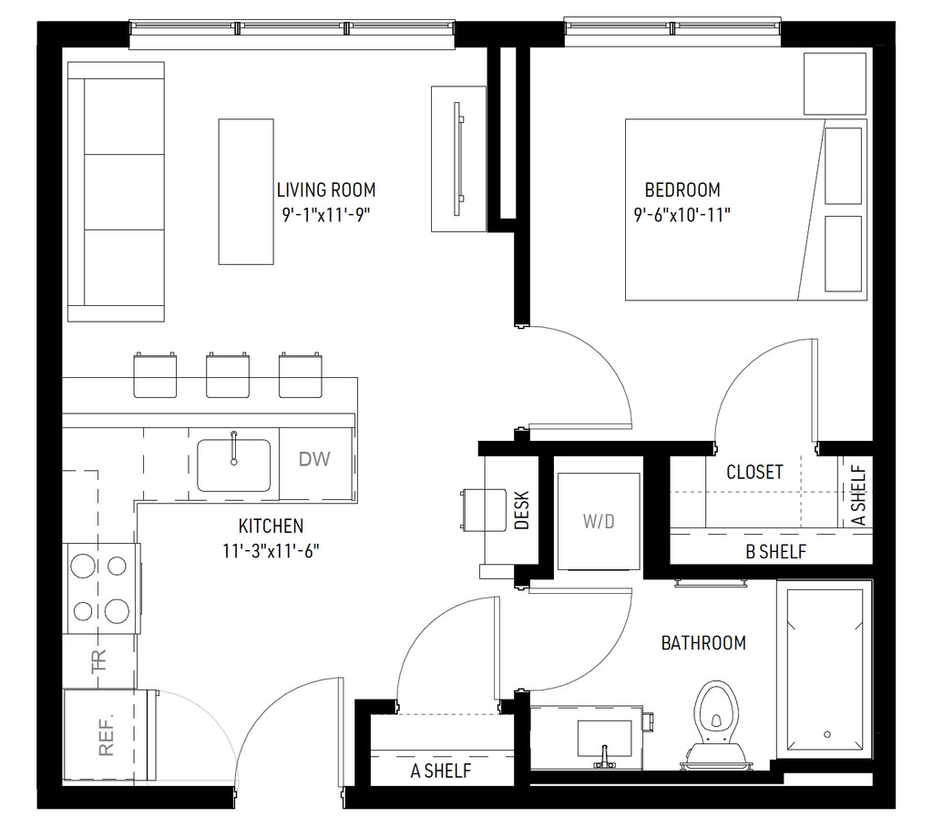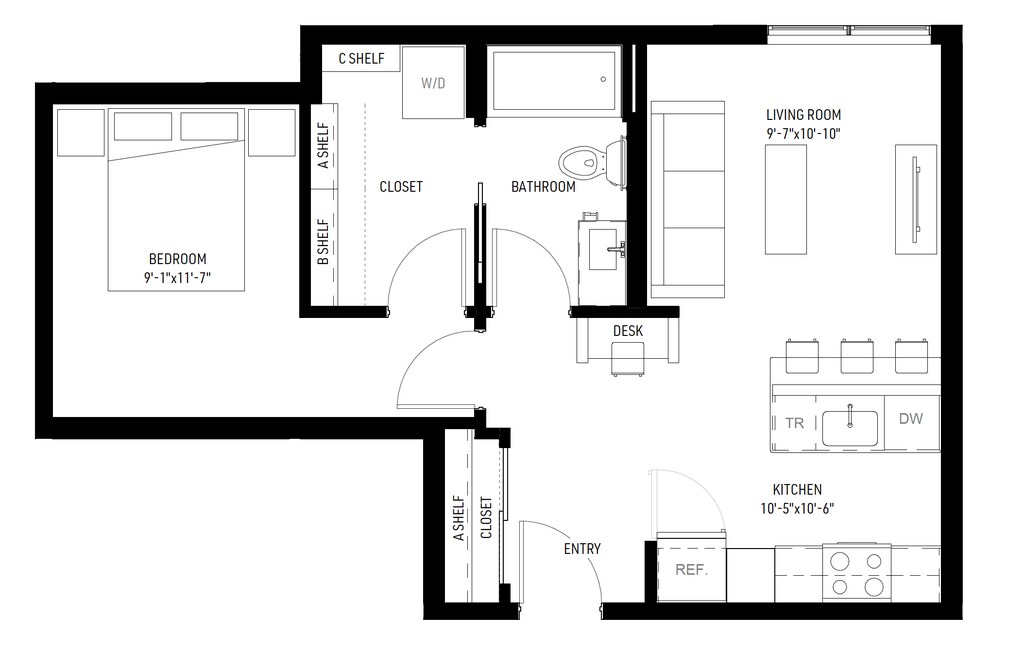 1 Dormitorio, 1 Baño, 505 pies²Precio Mensual TotalDisponible AhoraGalería del Modelo