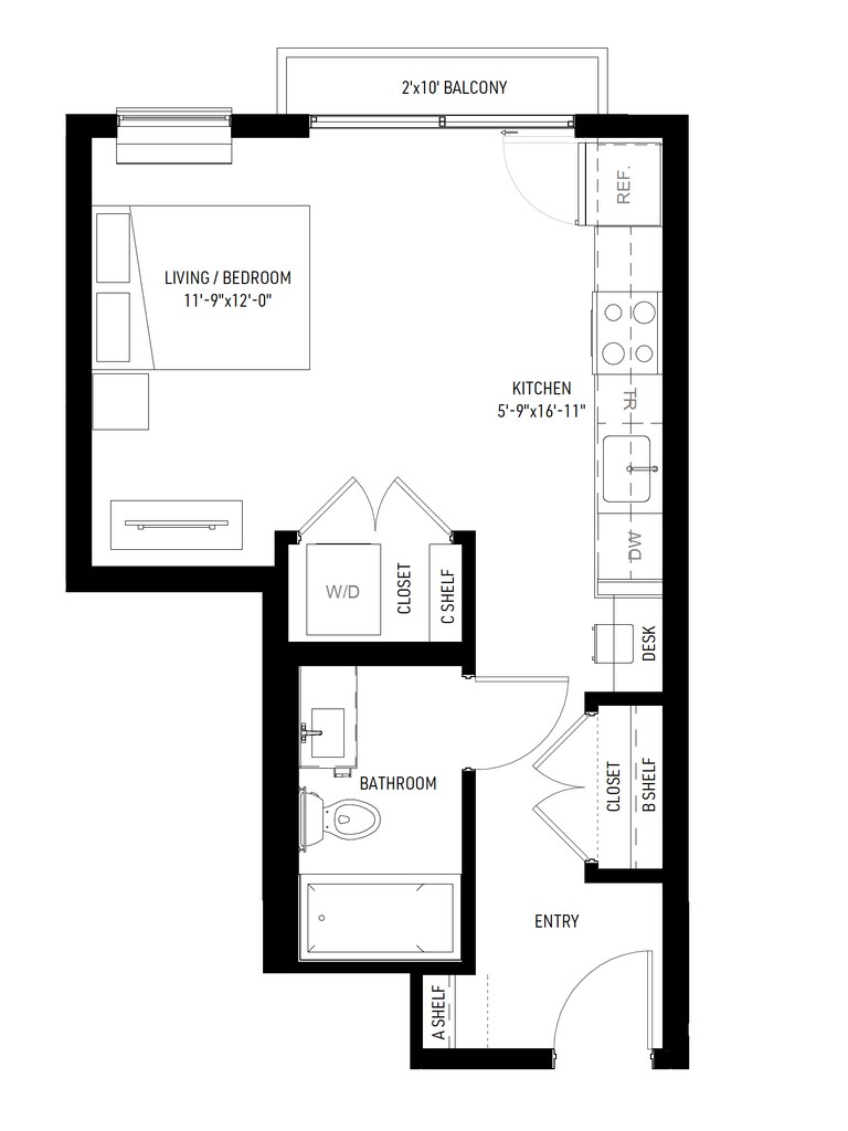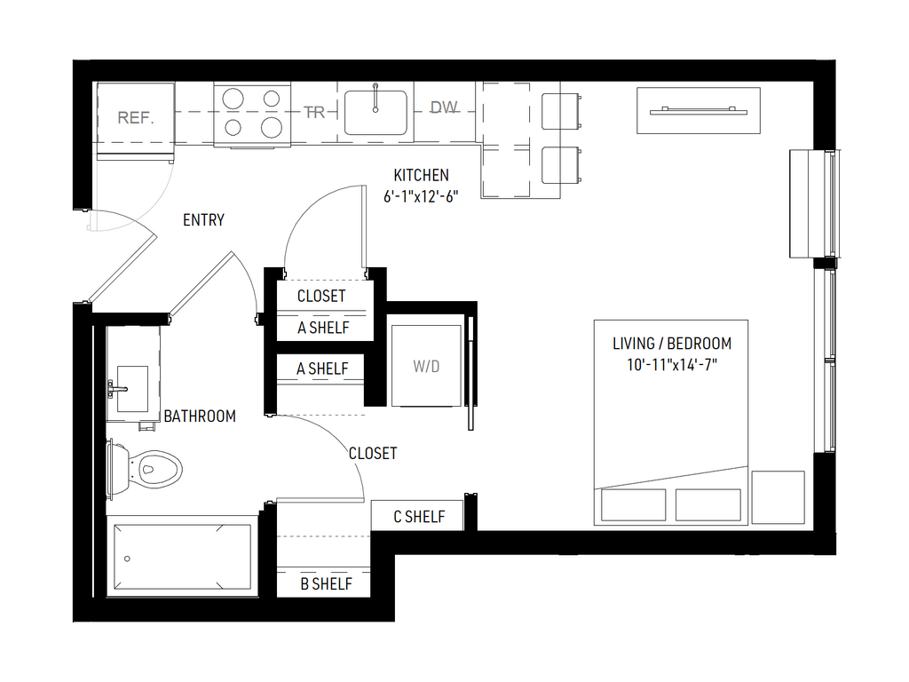 Modelo de apartamento: BellevueLlame para PreciosEstudio, 1 Baño, 450 sq ftNo Disponible![]()
