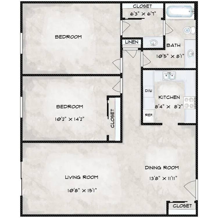 Modelo de apartamento: Hull Flats 2bdr$1,2502 Dormitorios, 1 Baño, 900 sq ftDisponible July 5, 2026![]()