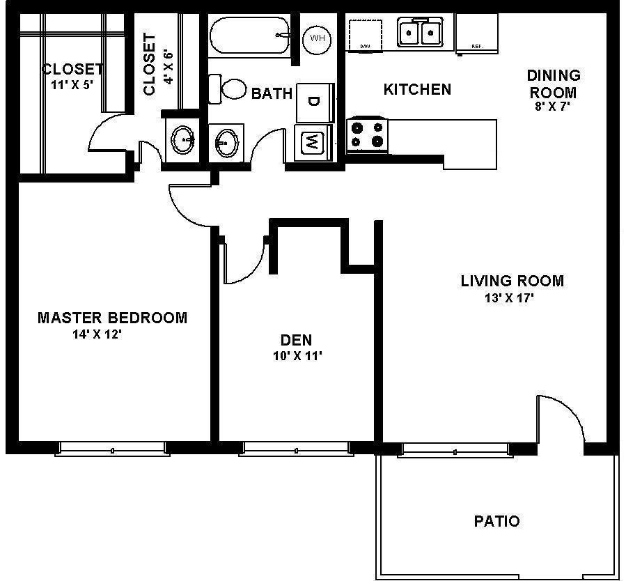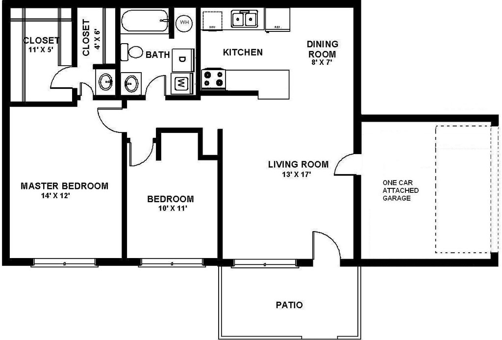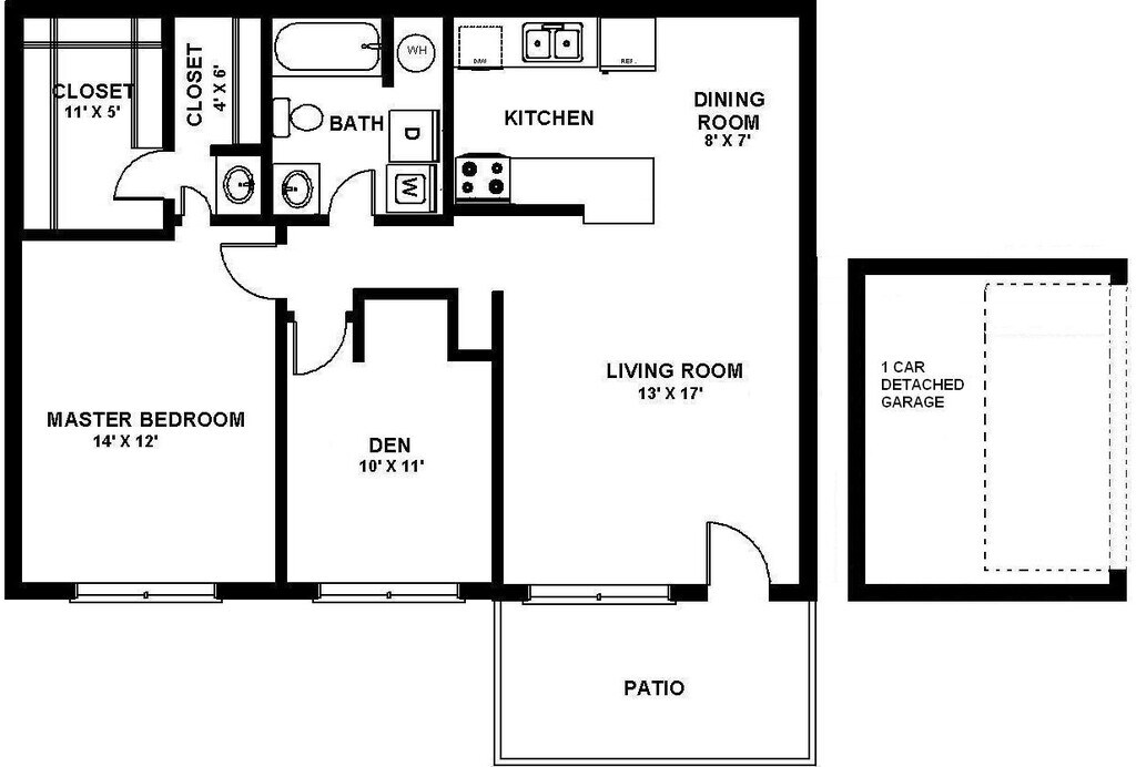 Modelo de apartamento: 2 Bed 1 Bath 1 Car DetachedDesde $1,1642 Dormitorios, 1 Baño, 950 sq ftNo Disponible2 Bed 1 Bath 1 Car Detached - Plano 1 2 Bed 1 Bath 1 Car Attached