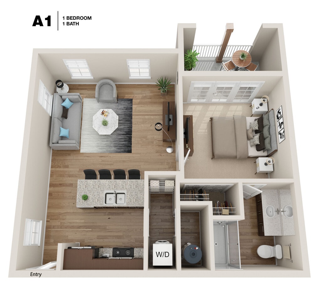 Modelo de apartamento: A1Desde $1,5301 Dormitorio, 1 Baño, 716 sq ftDisponible Ahora![]()