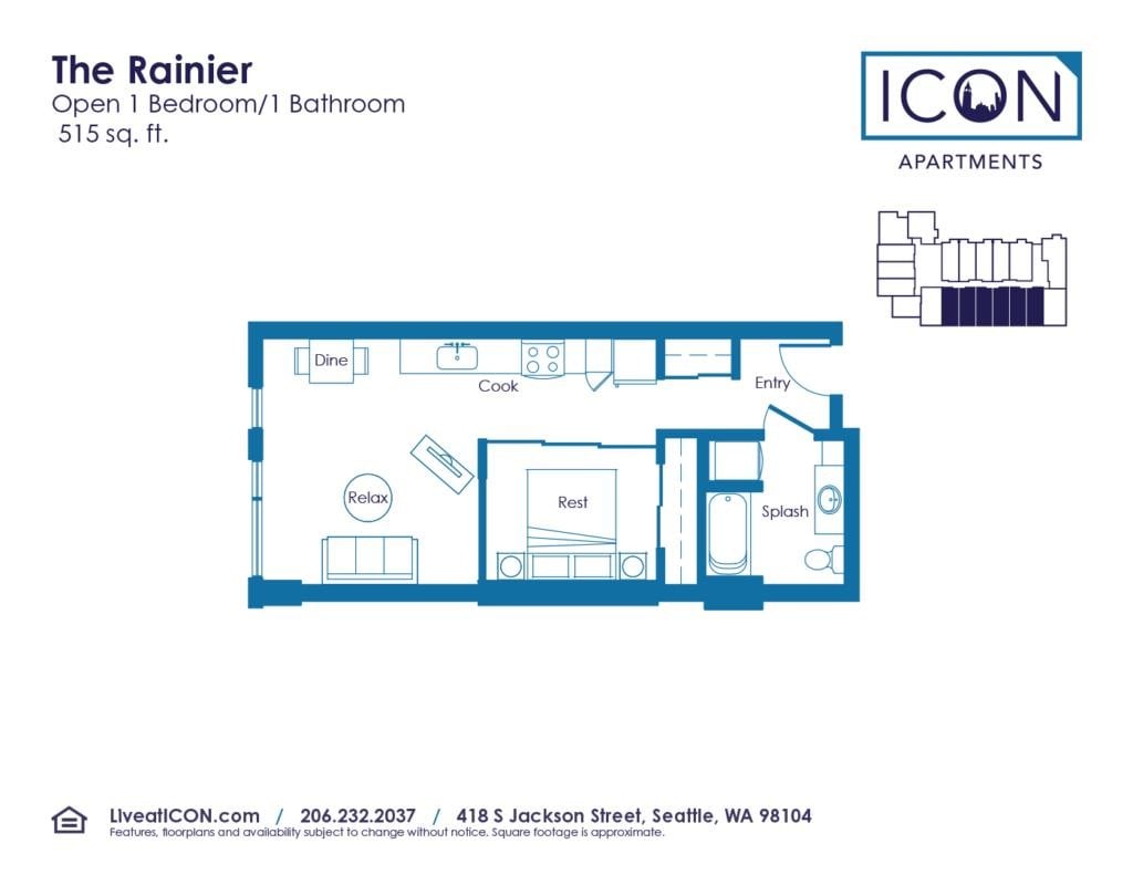 Modelo de apartamento: THE RAINIERDesde $1,6901 Dormitorio, 1 Baño, 536 sq ftDisponible AhoraPlanosFotos![]()