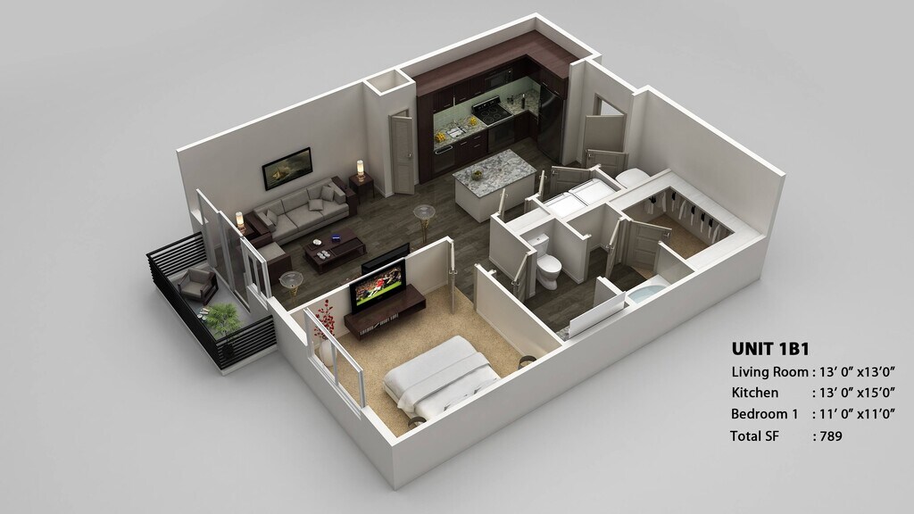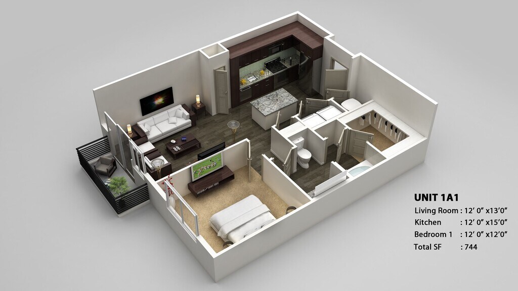 1 Dormitorio, 1 Baño, 744 pies²Disponible AhoraGalería del Modelo