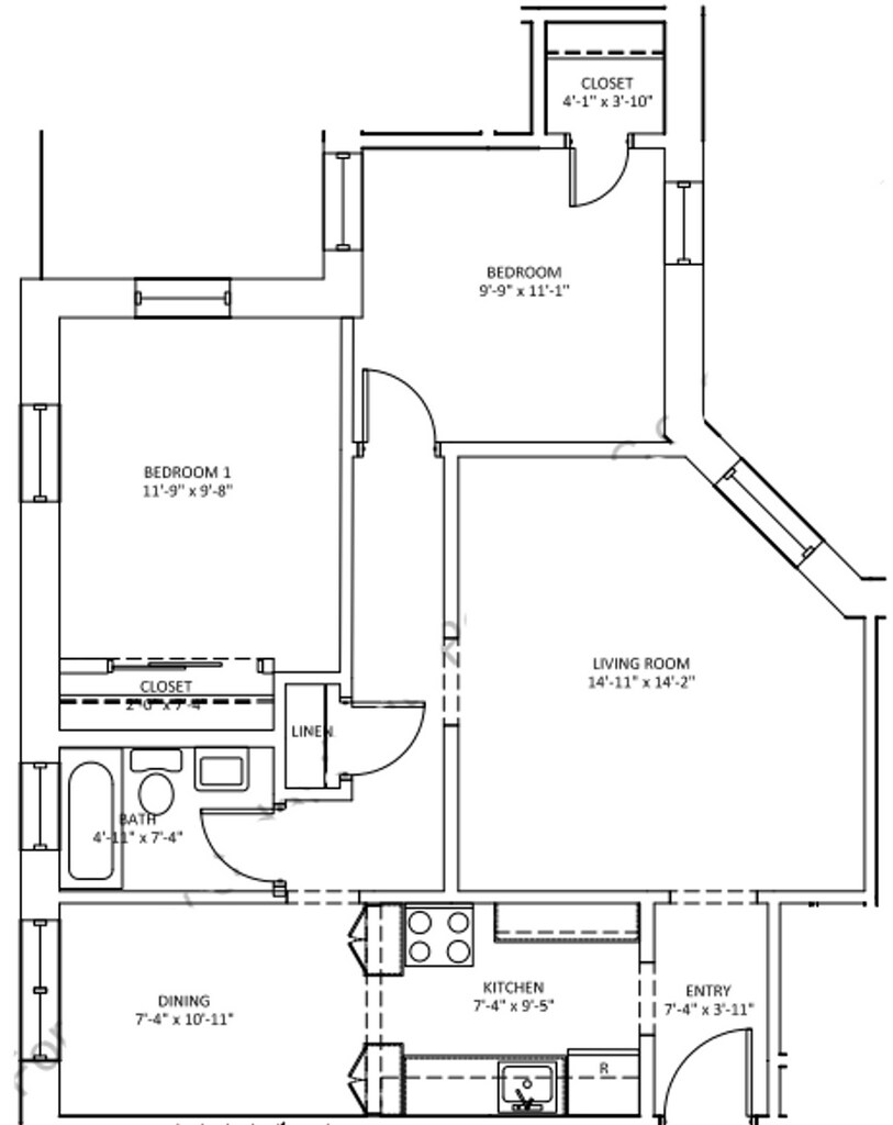 2 Dormitorios, 1 Baño, 875-1025 pies²Precio Mensual TotalDisponible May 1Galería del Modelo