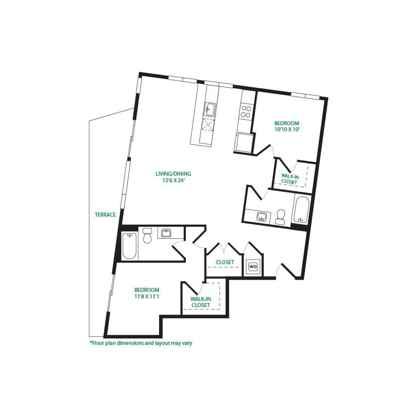 Modelo de apartamento: Open 1x1 0.1.3Desde $1,7591 Dormitorio, 1 Baño, 603 sq ftDisponible Ahora![]()