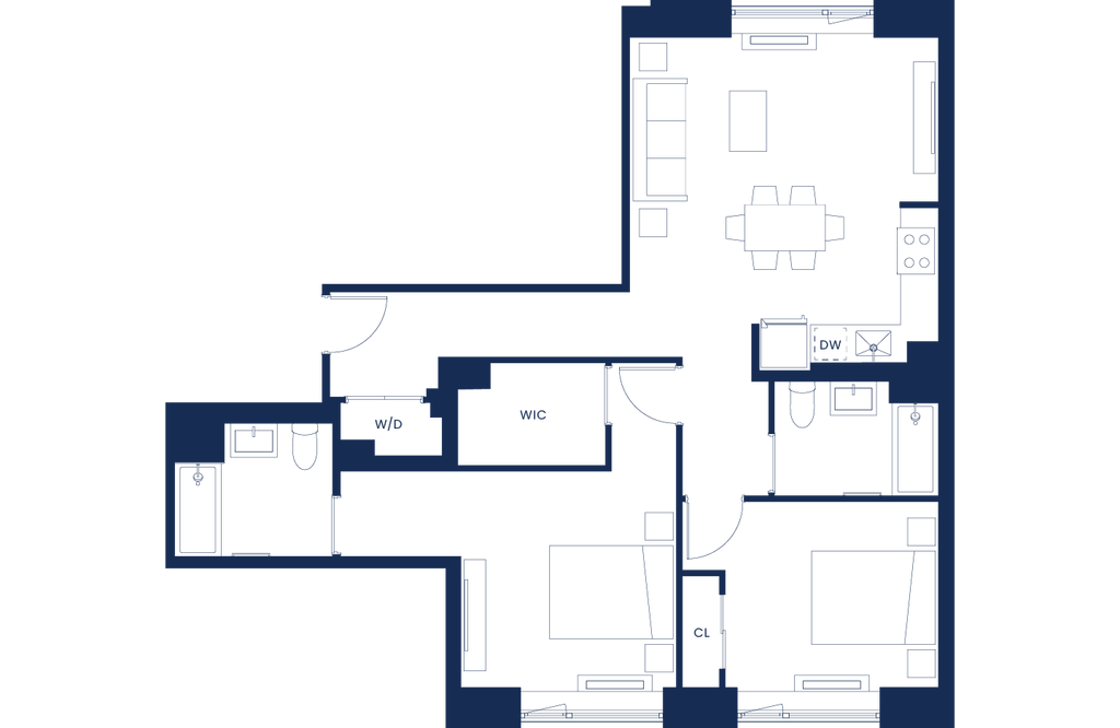 2 Bedroom Modern West Floors 2-12 - Plano 1 Unidad de apartamento: W802Modelo de apartamento: 2 Bedroom Modern West Floors 2-122 Dormitorios, 2 Baños, 1031 sq ftDisponible Ahora2 Bedroom Classic East Floors 2-5