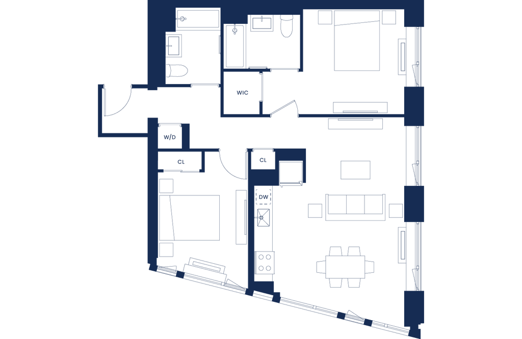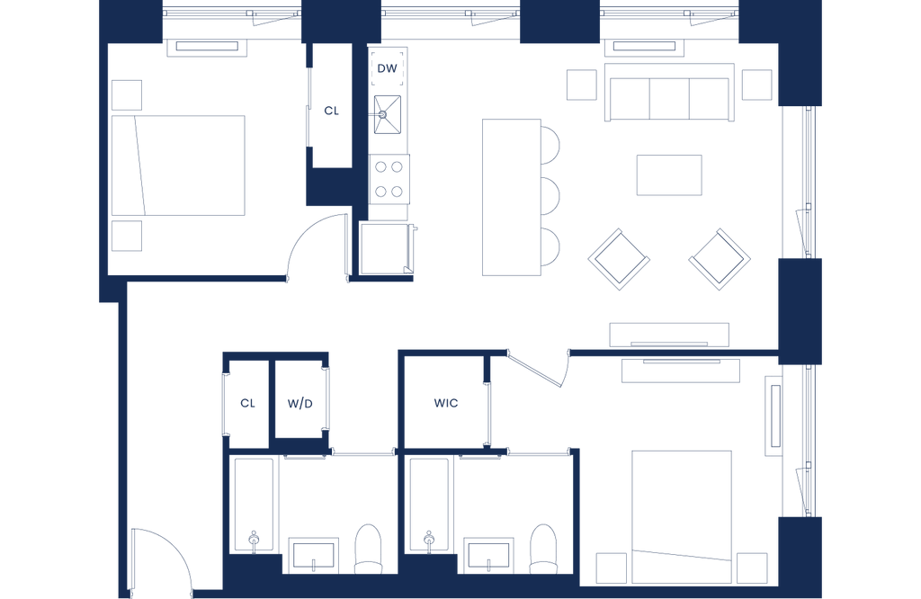 Modelo de apartamento: 2 Bedroom Lux West Floors 8-102 Dormitorios, 2 Baños, 1099-1102 sq ftNo Disponible![]()