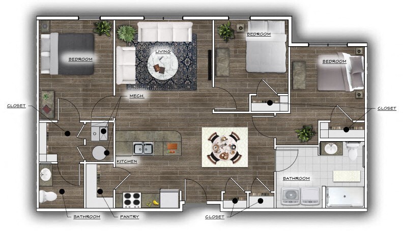 Modelo de apartamento: 3 Bedroom3 Dormitorios, 1.5 Baños, 1158 sq ftDisponible Ahora![]()