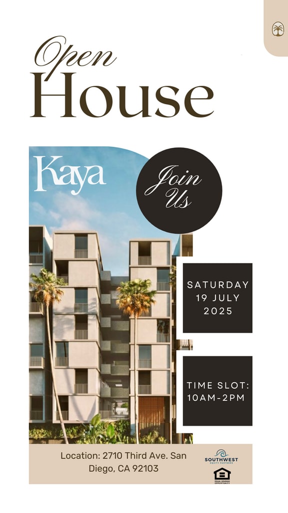 Kaya is a modern apartment community in Bankers Hill, thoughtfully designed to balance city convenience with natural tranquility. Located beside Olive Street Park and close to Balboa Park, Little Italy, and Hillcrest, residents enjoy easy access to trails, cultural attractions, dining, and entertainment. Each of Kaya’s 78 residences is designed with comfort in mind. Many homes feature sweeping views of the ocean, Olive Street Park, and Downtown - framed by floor-to-ceiling windows with sliding pocket doors that extend your living space to the outdoors. Authentic wood flooring, high ceilings from 9’3” to 15’, Bosch appliances, walk-in closets, and modern finishes create a refined living environment. The versatile 1 Bed + Den layout is especially popular. The den offers a flexible room that can evolve with your lifestyle. An office filled with natural light, a reading nook, a creative studio, or even a cozy guest space. Picture mornings working from a desk by the window, afternoons relaxing in the living area with doors open to fresh air, and evenings hosting friends in a space that feels open yet intimate. Designed by architect Jeff Svitak, Kaya features open-air walkways, illuminated glass-block corridors, and a lobby wrapped in Indonesian teak with curated art and custom furniture. Smart conveniences include community-wide WiFi, Latch keyless access, and water stations on every floor. At street level, residents gather at Communal Coffee or directly into Olive Street Park for connecting with friends. Our residents also get a monthly discount! Open house tours are held Saturdays from 1–3 pm, or schedule a private showing with our Community Manager at 619.963.KAYA. Kaya provides more than a residence; it offers thoughtfully designed spaces that encourage comfort, wellness, and connection. Learn more at