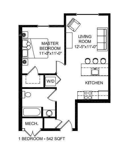 1 Dormitorio, 1 Baño, 542 pies²Galería del Modelo