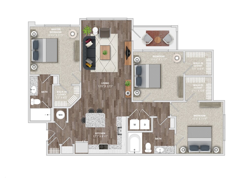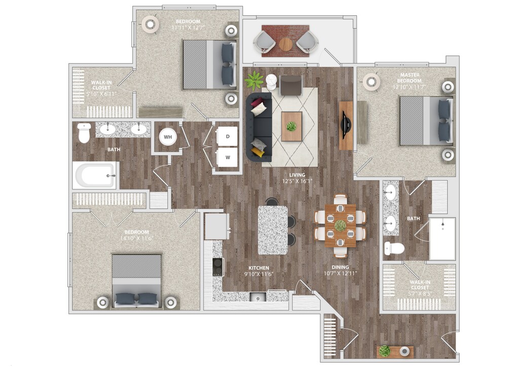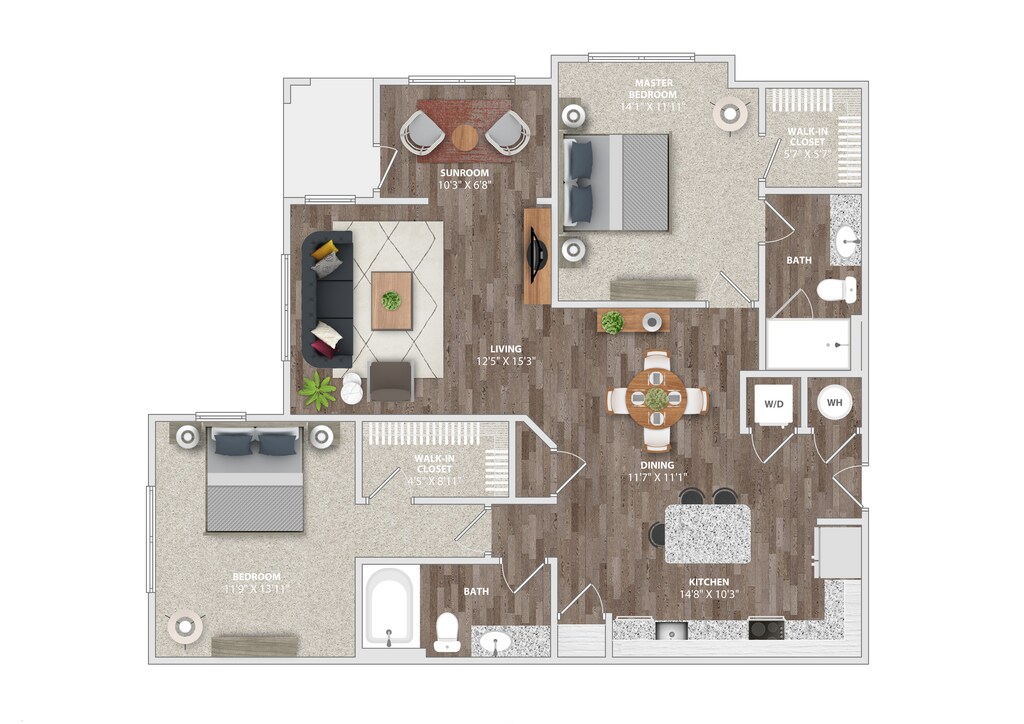 Modelo de apartamento: A1ADesde $1,2611 Dormitorio, 1 Baño, 681 sq ftDisponible Ahora![]()