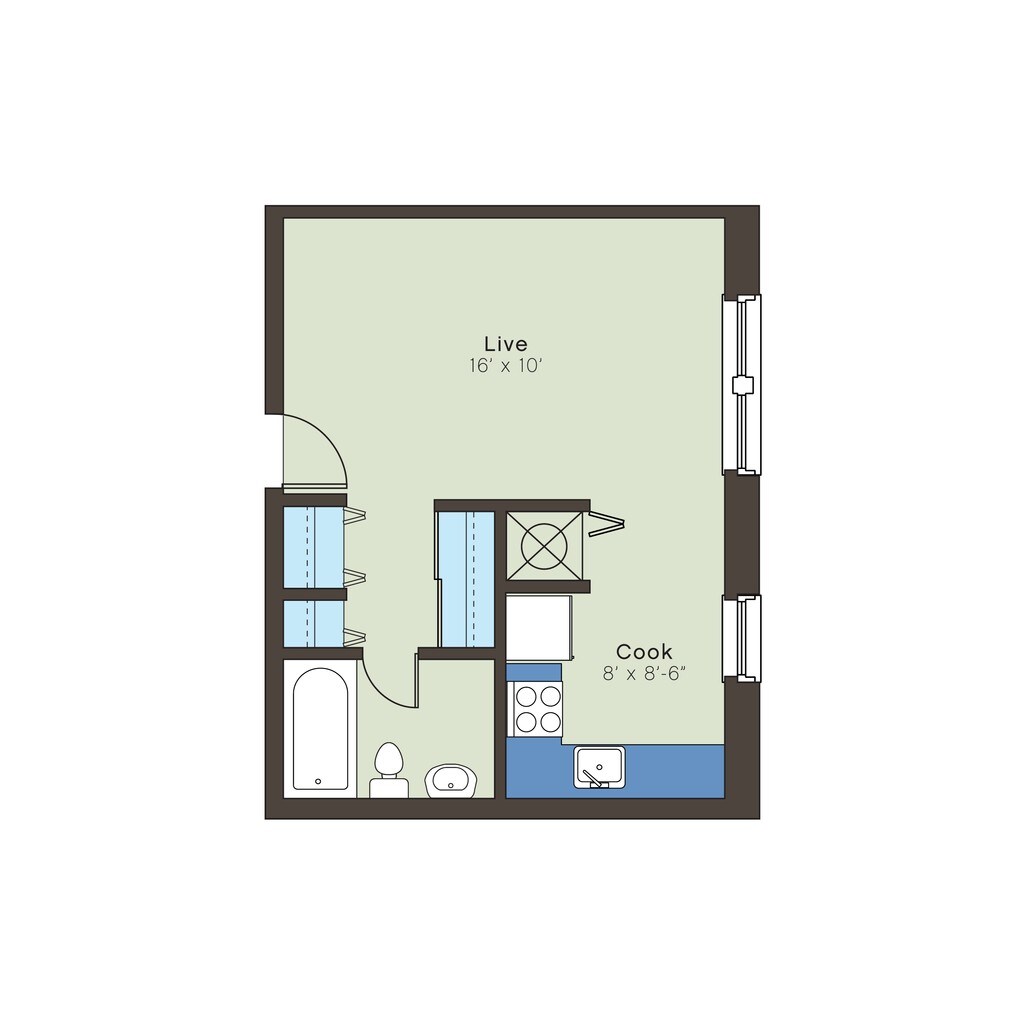 Modelo de apartamento: knwd-1bf_aLlame para Precios1 Dormitorio, 1 Baño, 431 sq ftNo Disponibleknwd-1bf_a - Plano 1 knwd-1bd_a