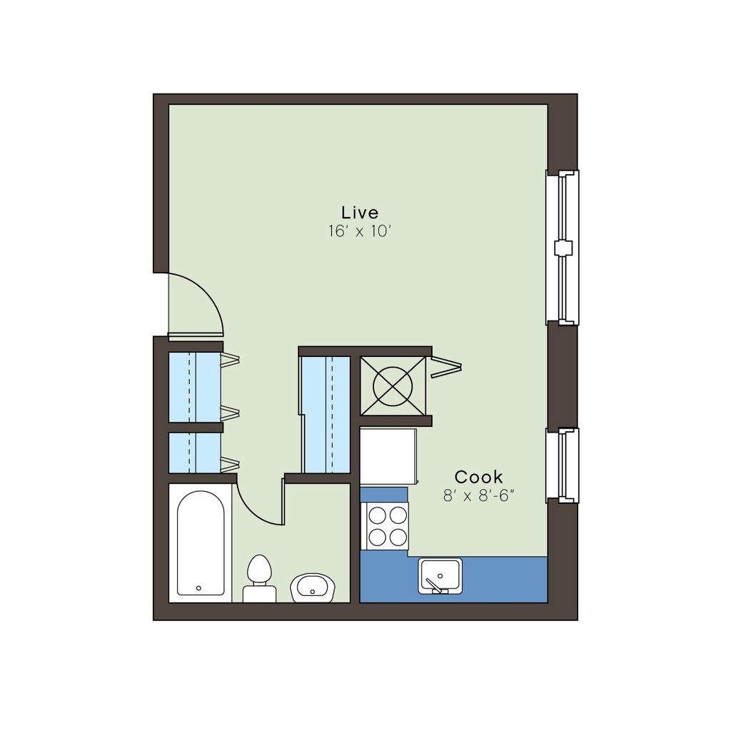 Modelo de apartamento: knwd-1ba_aLlame para Precios1 Dormitorio, 1 Baño, 431 sq ftNo Disponibleknwd-1ba_a - Plano 1 knwd-1bf_a