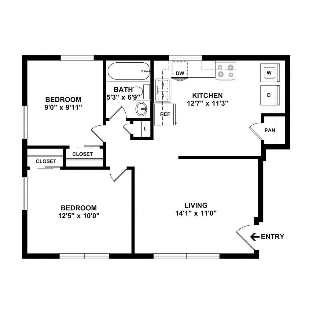2 Dormitorios, 1 Baño, 660 pies²Disponible AhoraGalería del Modelo