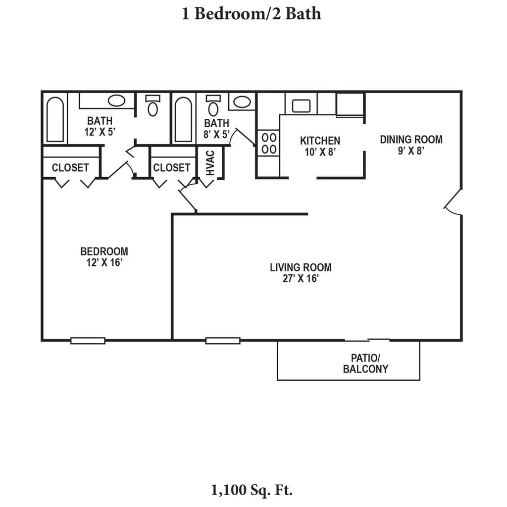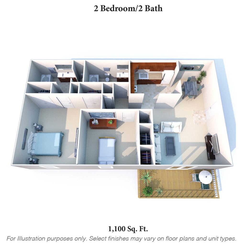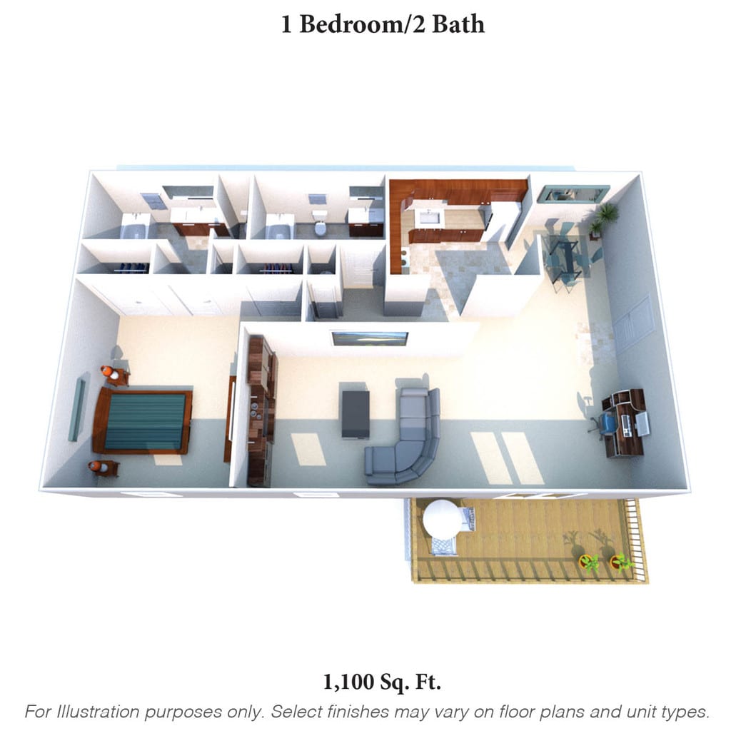 1 Dormitorio, 2 Baños, 1100 pies²El más grandeEsta opción tiene las unidades más grandes para este modeloGalería del Modelo