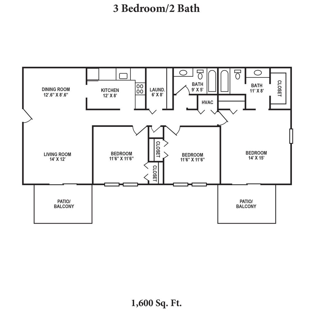 Modelo de apartamento: 3 Bedroom 2 Bath$1,4253 Dormitorios, 2 Baños, 1600 sq ftNo Disponible![]()
