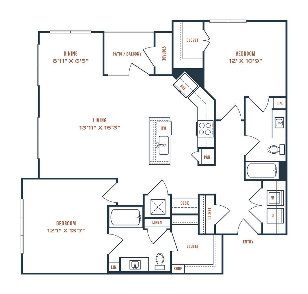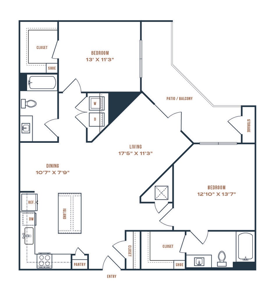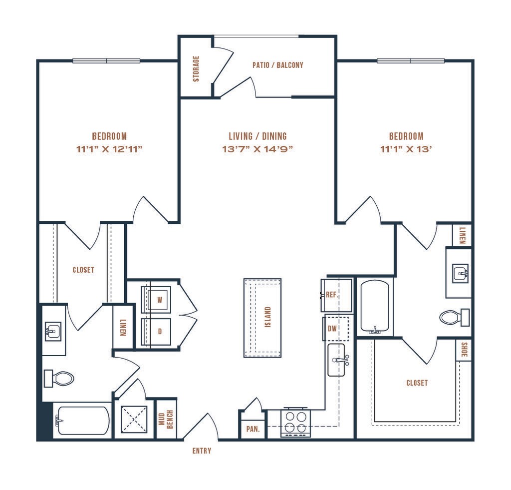 Modelo de apartamento: A3Desde $1,5011 Dormitorio, 1 Baño, 770-805 sq ftDisponible Ahora![]()