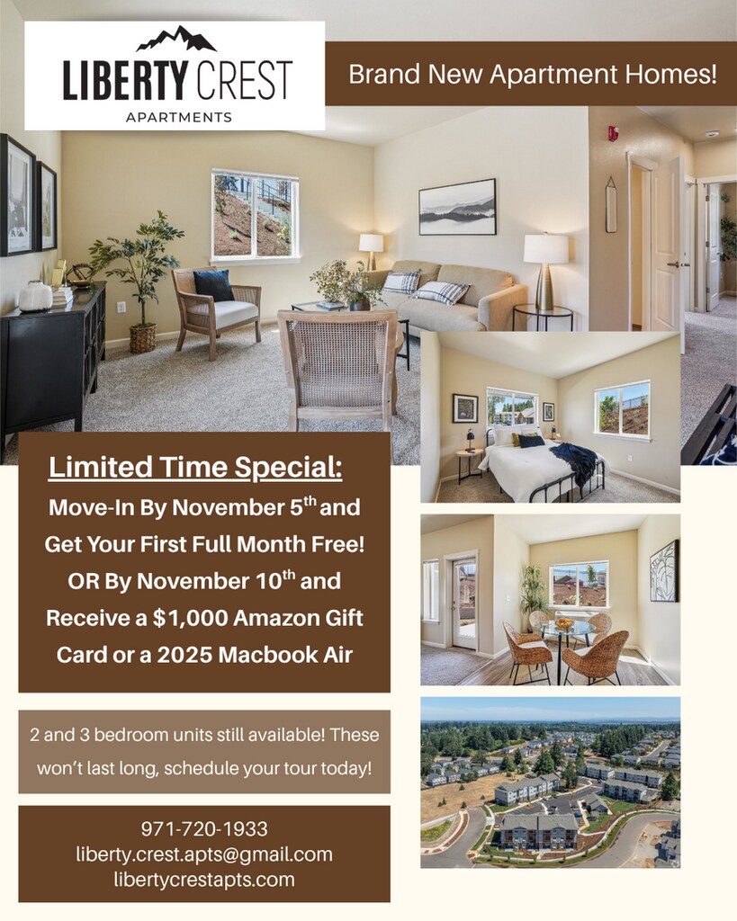 NOW LEASING! Thank you for your interest in Liberty Crest Apartments, located in the beautiful South Salem area. These brand new apartment homes are now ready for move in! Reserve your apartment today and be the first to call it home. LIMITED TIME SPECIALS! - 2 bed x 2 bath (1,139 sq. ft.): First full month FREE! - 2 bed x 2 bath (1,005 sq. ft.): Move-in by January 15th and choose from one of the three electronics packages! **Ask leasing office for details** We are proud to offer modern one, two, and three-bedroom apartment homes, thoughtfully designed with stylish finishes and contemporary layouts. Our brand-new residences combine comfort and sophistication to create the perfect living space. Application & Deposits: - $65 application fee per adult - Apply within 24 hours of your visit & have the fee credited to your first month’s rent! - Security deposit: $500 to one month’s rent (based on approval) Pet Policy: - One dog (max 25 lbs) allowed per household, cats not allowed - $500 deposit + $25/month pet rent - Qualified service/companion animals permitted under ADA & Fair Housing laws Utilities: - Water/Sewer/Garbage: Billed monthly based on usage and square footage. The estimated range is $75-$125/month. To help offset utility expenses, the property covers 10% of the total bill, with residents responsible for the remainder - Electricity: Residents are required to establish and maintain their own individual electric service account with PGE Electric - Wifi: Xfinity WiFi routers are pre-installed in each unit. Residents are responsible for activating the service and covering all associated costs directly with the provider For more information, visit our website: If you have any questions or would like to schedule a tour, feel free to contact us. We’d love to help you find your new home at Liberty Crest! Equal Housing Provider Proudly Managed by Norris & Stevens