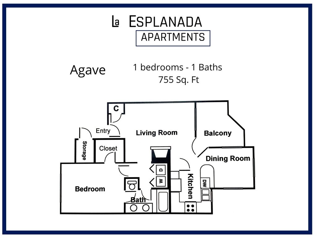 Modelo de apartamento: AgaveDesde $1,5591 Dormitorio, 1 Baño, 755 sq ftNo Disponible![]()