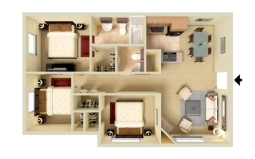 Modelo de apartamento: 3X1.5lfa$1,0753 Dormitorios, 1.5 Baños, 1000 sq ftDisponible April 9, 2026![]()