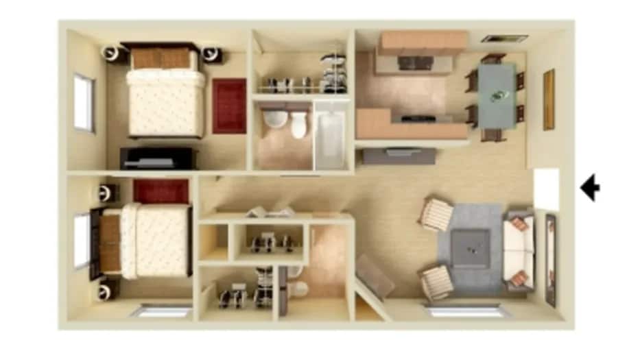 Modelo de apartamento: 2X1.5lfa$9752 Dormitorios, 1.5 Baños, 900 sq ftDisponible June 10, 2026![]()