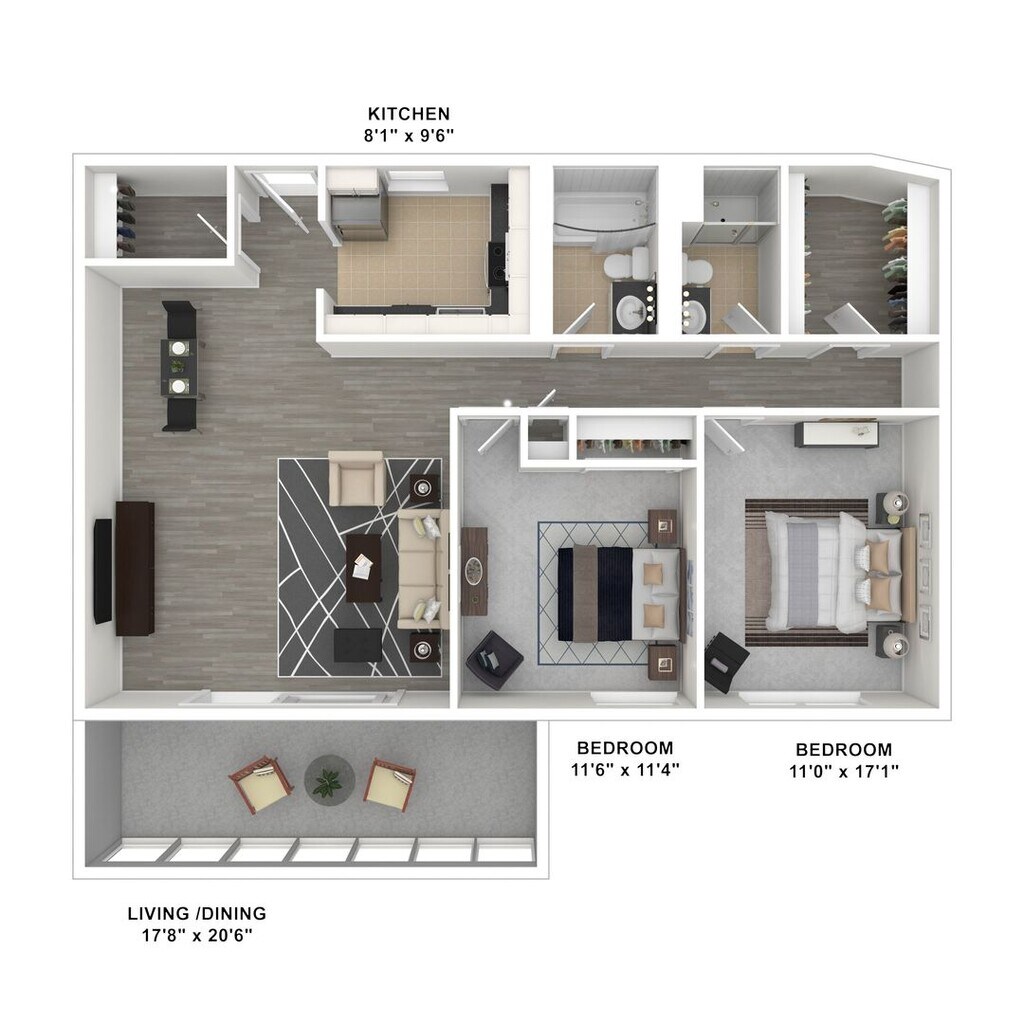 2 Dormitorios, 1 Baño, 1000 pies²Disponible AhoraGalería del Modelo