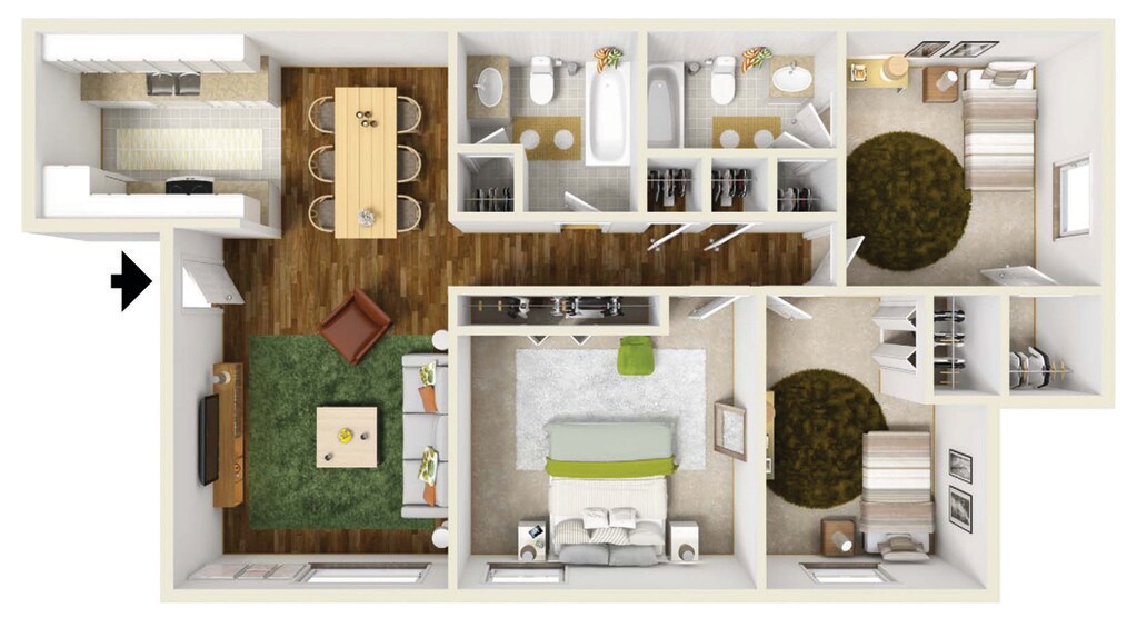 3bd - Plano 3 Unidad de apartamento: 212Modelo de apartamento: 3bd3 Dormitorios, 2 Baños, 1110 sq ftDisponible Ahora