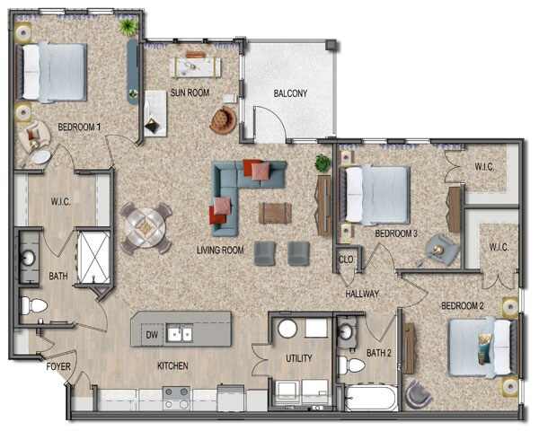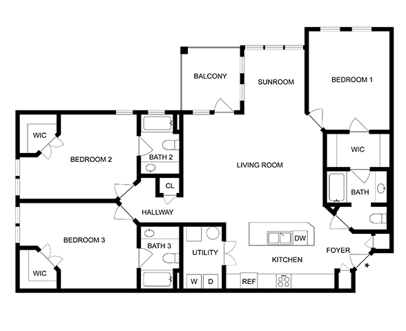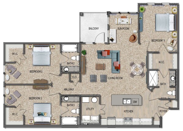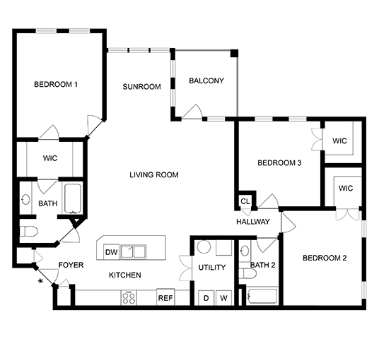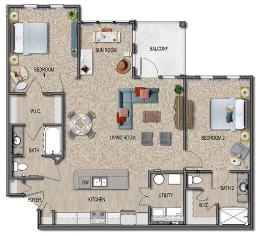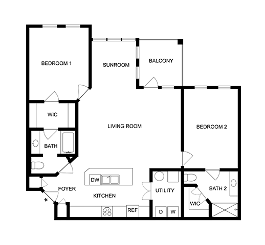 Modelo de apartamento: A1Desde $1,3691 Dormitorio, 1 Baño, 989 sq ftDisponible Ahora![]()