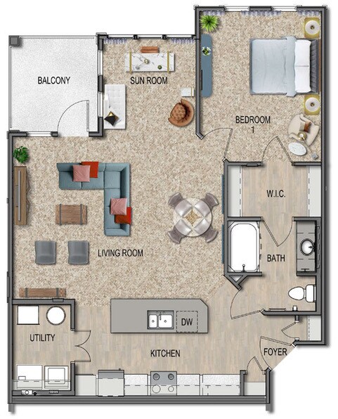 1 Dormitorio, 1 Baño, 592 pies²Disponible AhoraGalería del Modelo