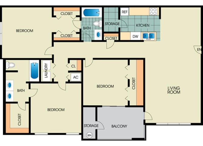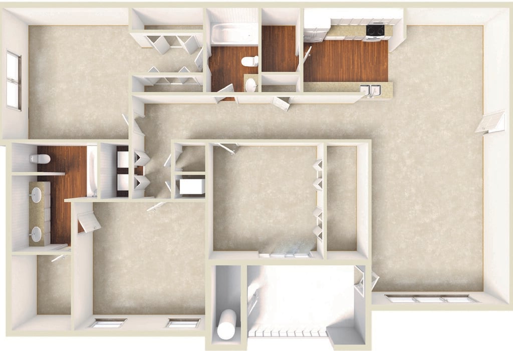 Modelo de apartamento: Magnolia -3BD 2BTH3 Dormitorios, 2 Baños, 1429-1450 sq ftNo Disponible![]()