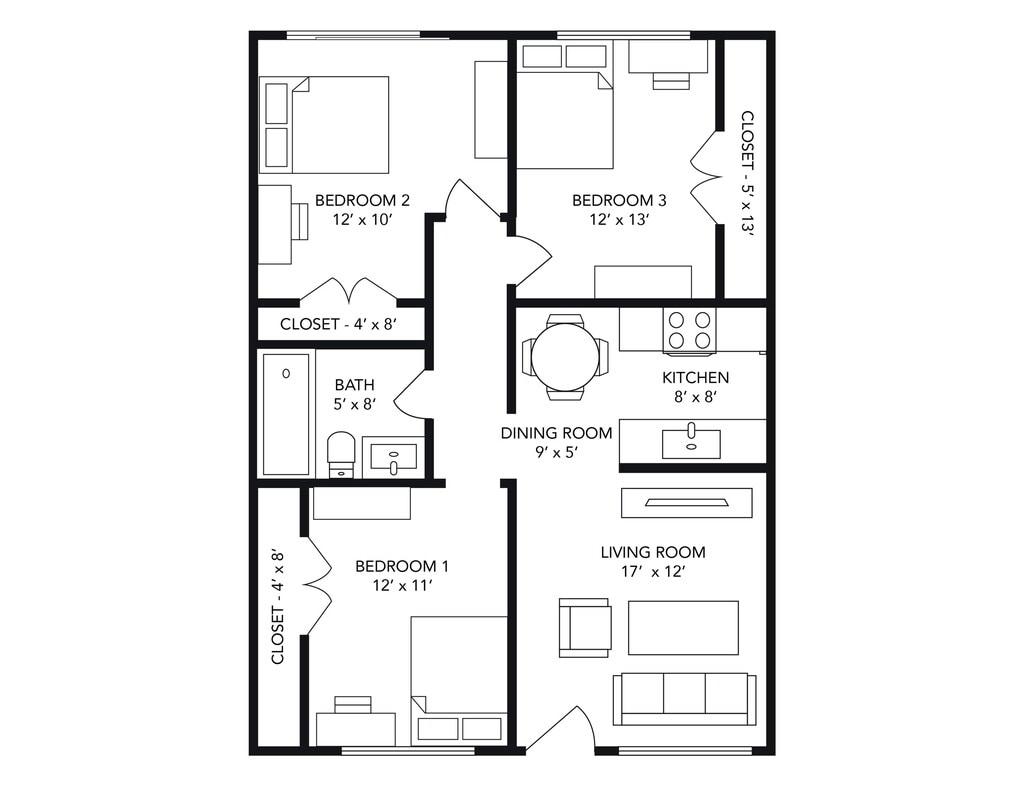 Modelo de apartamento: 3x1Llame para Precios3 Dormitorios, 1 Baño, 1065 sq ftNo Disponible![]()
