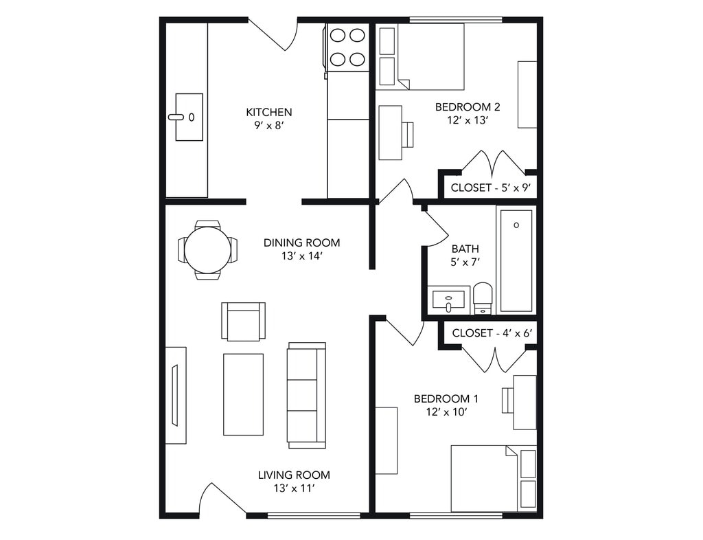 Modelo de apartamento: 2x1ADesde $8002 Dormitorios, 1 Baño, 884 sq ftDisponible AhoraPlanosFotos![]()