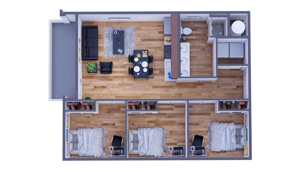 3 Dormitorios, 1 Baño, 759 pies²Disponible AhoraGalería del Modelo