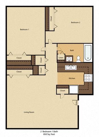 2 Dormitorios, 1 Baño, 750 pies²Disponible AhoraGalería del Modelo