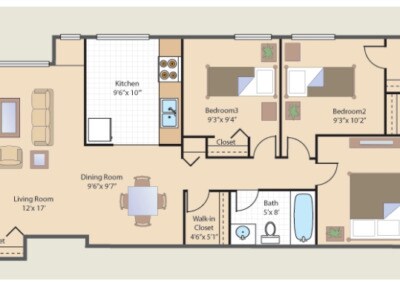 2 Beds, 1 bath - Plano 1 3 Dormitorios