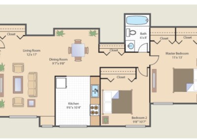 2 Dormitorios, 1 Baño, 578 pies²Galería del Modelo