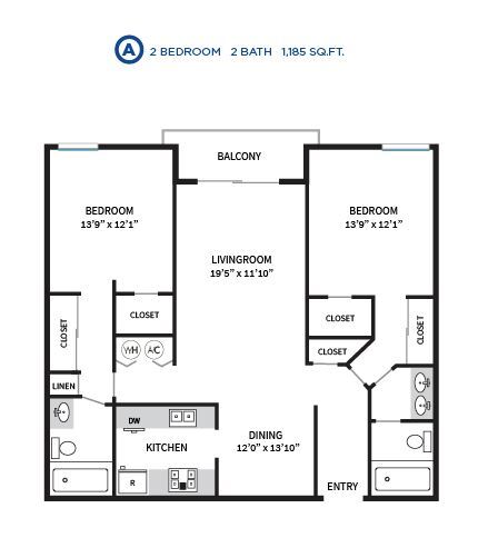 Modelo de apartamento: A Floor PlanDesde $2,9402 Dormitorios, 2 Baños, 1185 sq ftDisponible Ahora![]()