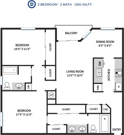 Modelo de apartamento: D Floor PlanDesde $2,6502 Dormitorios, 2 Baños, 1150 sq ftNo Disponible![]()