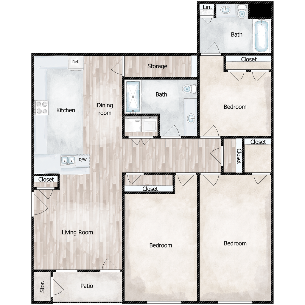 2x2.5 1,200 SqFt - Plano 1 3 Dormitorios
