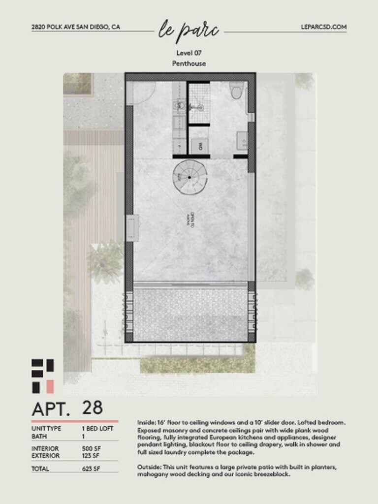 Emerging from the homogenous soup of wood-frame, tan-and-gray stucco apartment buildings, Le Parc rises unapologetically. Eight stories of sculpted masonry, concrete, glass, and Corten steel. Modern brutalism softened by light, landscape, and human scale. A building that believes architecture should once again have a point of view. Designed as a response to sameness and shortcuts, Le Parc is intentional in every detail. Open-air walkways weave through rich, organic vegetation, evoking the feeling of a quiet ruin gently reclaimed by nature. Subtle architectural uplighting brings the building to life at dusk, revealing texture, shadow, and depth—creating an atmosphere that feels calm, cinematic, and quietly transportive, with inspiration drawn from Japanese and Balinese landscapes. Inside, thoughtfully designed studios, high-ceiling lofts, and spacious two-bedroom residences feature floor-to-ceiling windows, blackout shades and curtains, integrated stainless-steel appliances, in-unit laundry, and AC and heat. Select homes include gated private patios, while a rooftop lounge above frames expansive views of the San Diego skyline. Le Parc is for people seeking inspiration from their surroundings—those ready to make a meaningful change, start something new, or simply feel transported to a different world without leaving San Diego. Rooted in the heart of walkable North Park, steps from cafés, parks, and transit, Le Parc isn’t trying to be everything for everyone. It’s for people who notice buildings. Architecture has returned—confidently, deliberately, and without apology. Highlights Studios, lofts, and two-bedroom residences High ceilings in select lofts Floor-to-ceiling windows with blackout shades Integrated stainless-steel appliances In-unit laundry, AC and heat Gated private patios in select units Rooftop lounge with panoramic city views Pet-friendly, walkable North Park location CA DRE #01523691