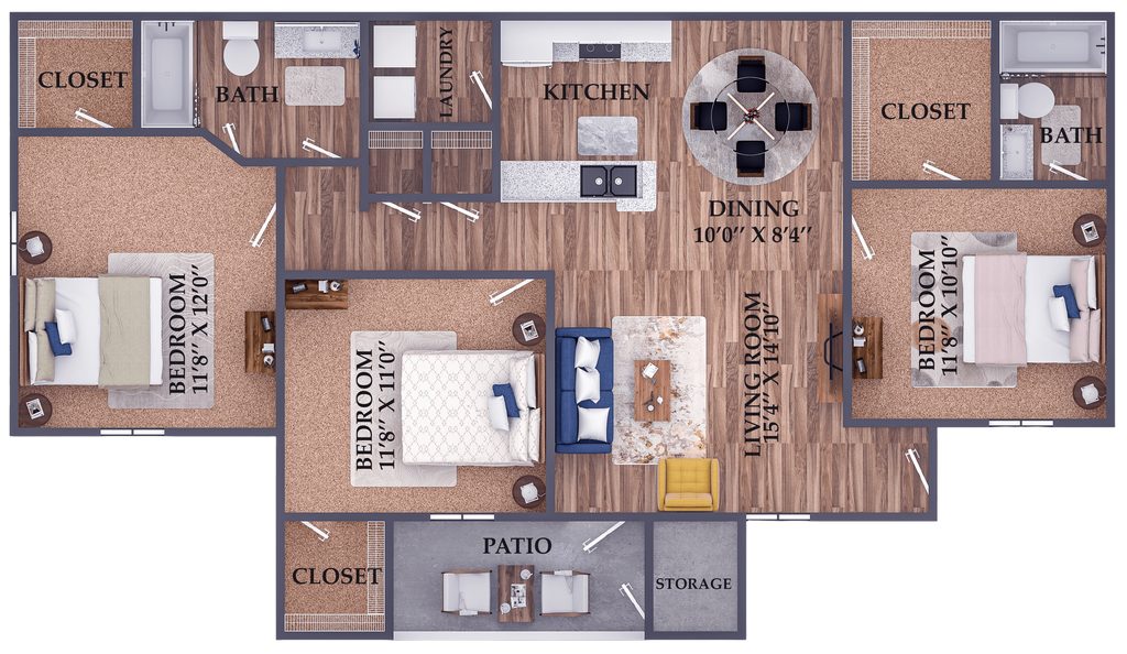 Modelo de apartamento: WillowDesde $1,1592 Dormitorios, 2 Baños, 1072 sq ftDisponible Ahora![]()