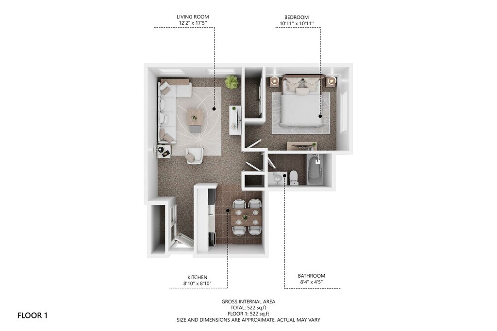 A1 Renovated - Imagen 9 Los planos son representaciones artísticas. Todas las dimensiones son aproximadas. El producto y las especificaciones reales pueden variar en tamaño o detalle. No todas las características están disponibles en cada vivienda en alquiler. Por favor, consulta con un representante para obtener más detalles.