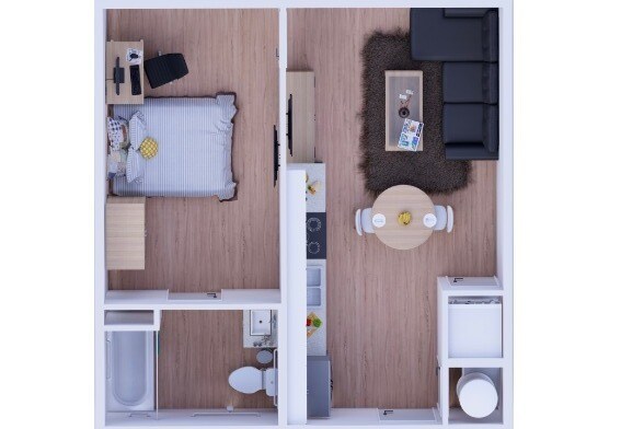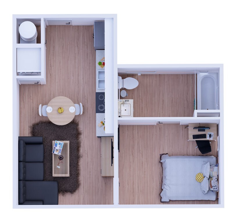 1 Dormitorio, 1 Baño, 500 pies²Disponible August 21, 2026Galería del Modelo