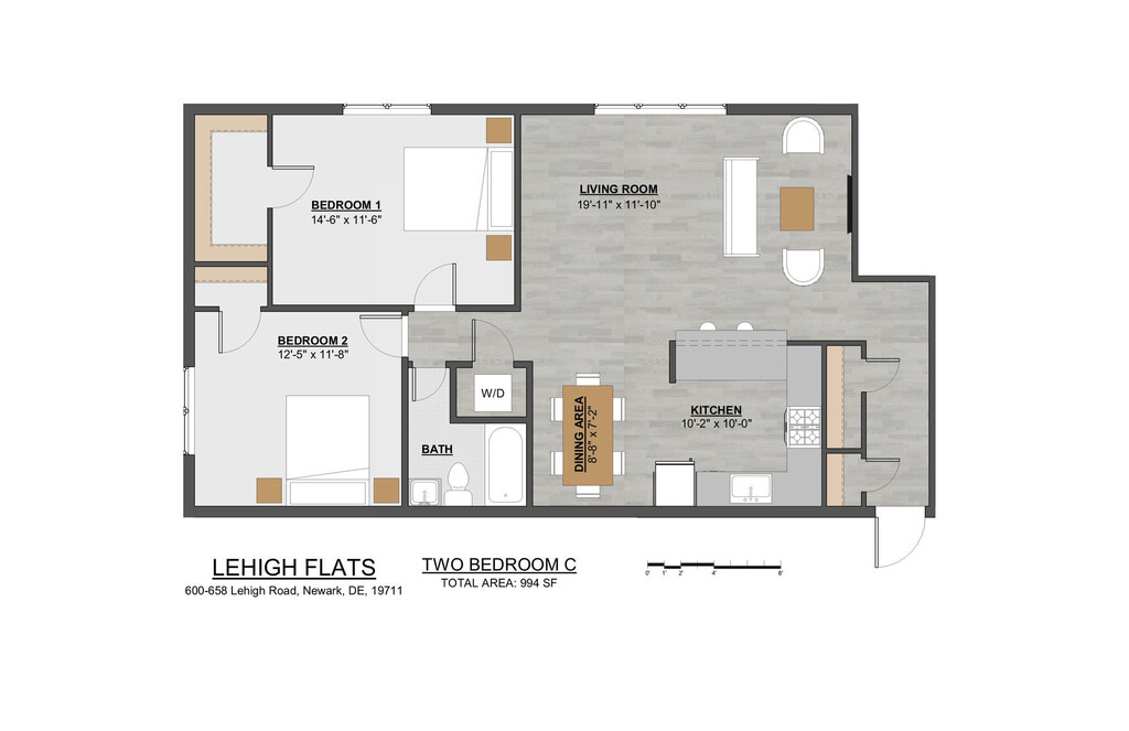 2 Dormitorios, 1 Baño, 994 pies²Galería del Modelo