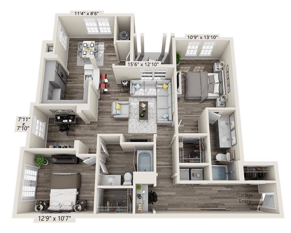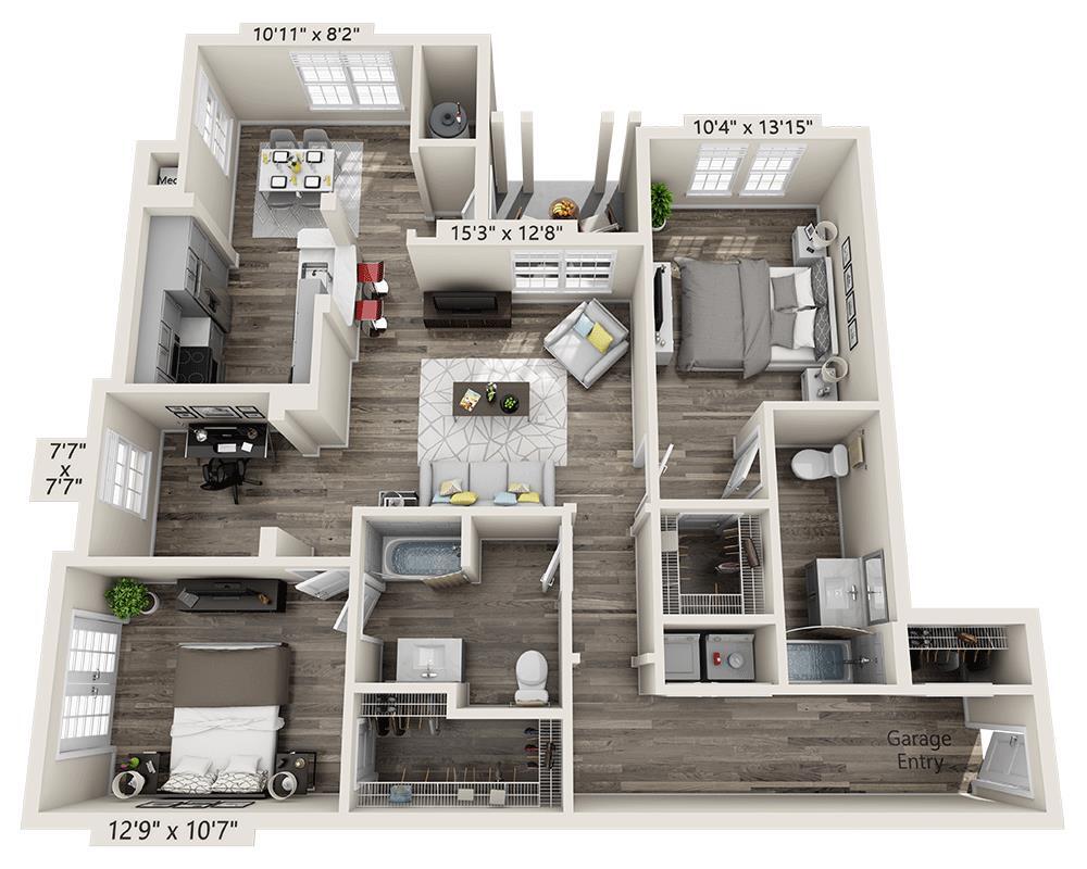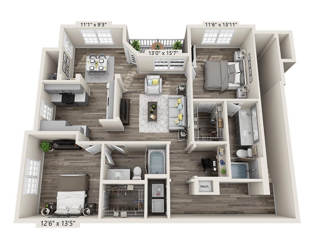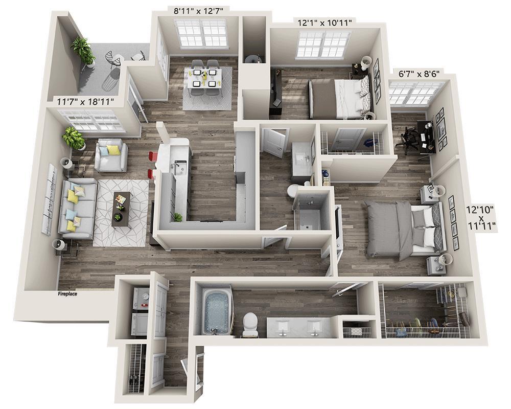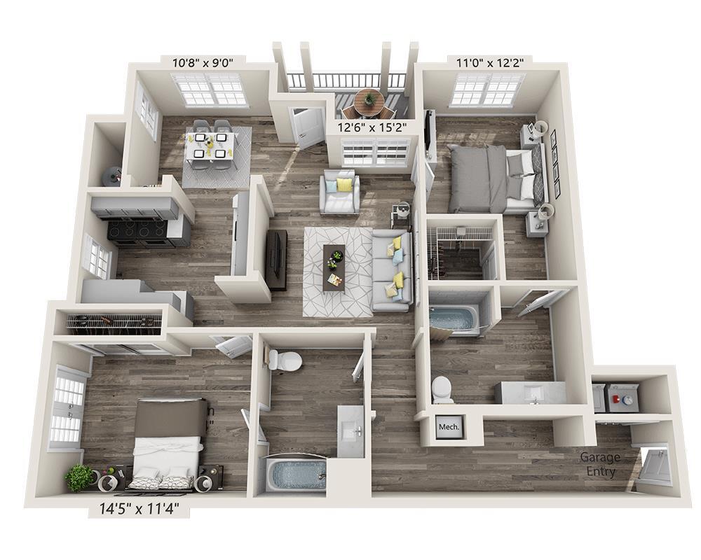 Modelo de apartamento: Plan D1 (A1AD)$2,9961 Dormitorio, 1 Baño, 1231 sq ftDisponible Ahora![]()