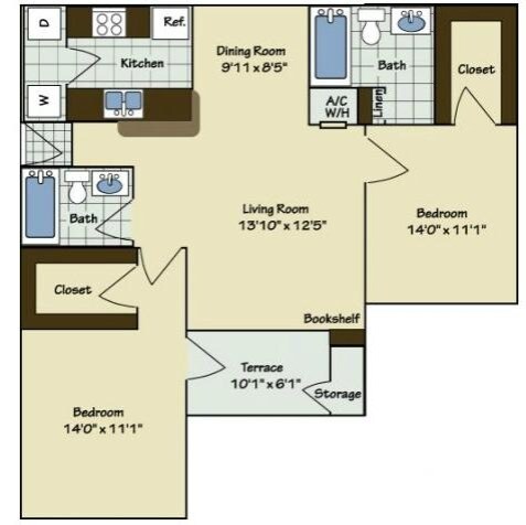 Modelo de apartamento: A2Desde $1,3011 Dormitorio, 1 Baño, 842 sq ftDisponible Ahora![]()