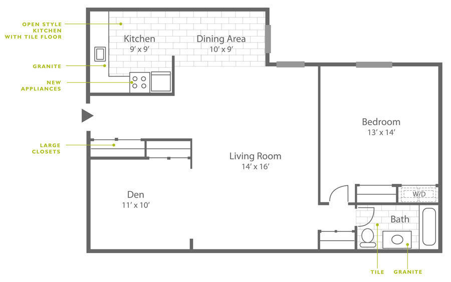 Modelo de apartamento: 1 Bed | 1 Bath | Den1 Dormitorio, 1 Baño, sq ftDisponible Ahora1 Bed | 1 Bath | Den - Plano 1 Unidad de apartamento: 00105Modelo de apartamento: 1 Bed | 1 Bath | Den1 Dormitorio, 1 Baño, sq ftDisponible Ahora1 Bed | 1 Bath