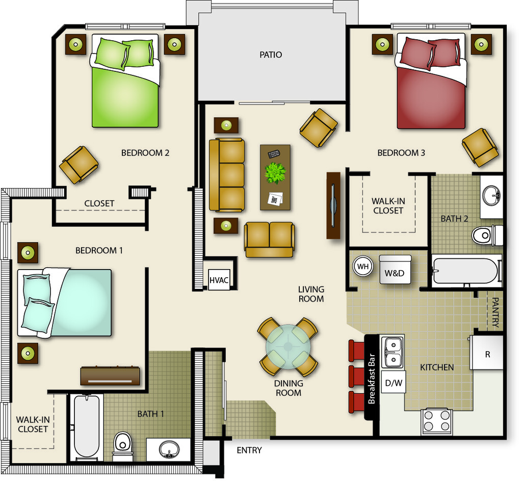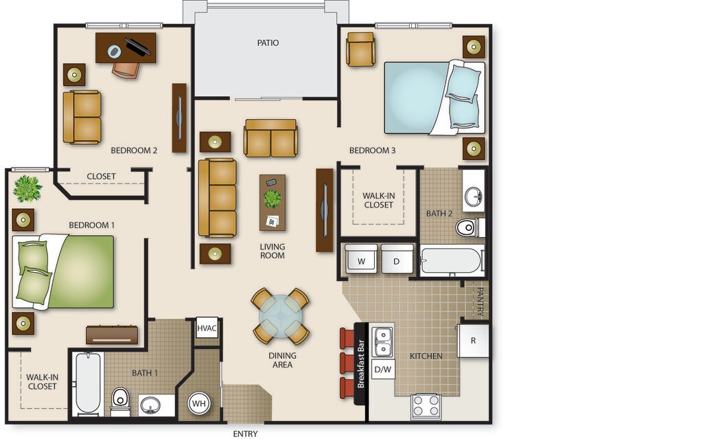 Modelo de apartamento: SunsetDesde $1,6563 Dormitorios, 2 Baños, 1102 sq ftDisponible Ahora![]()