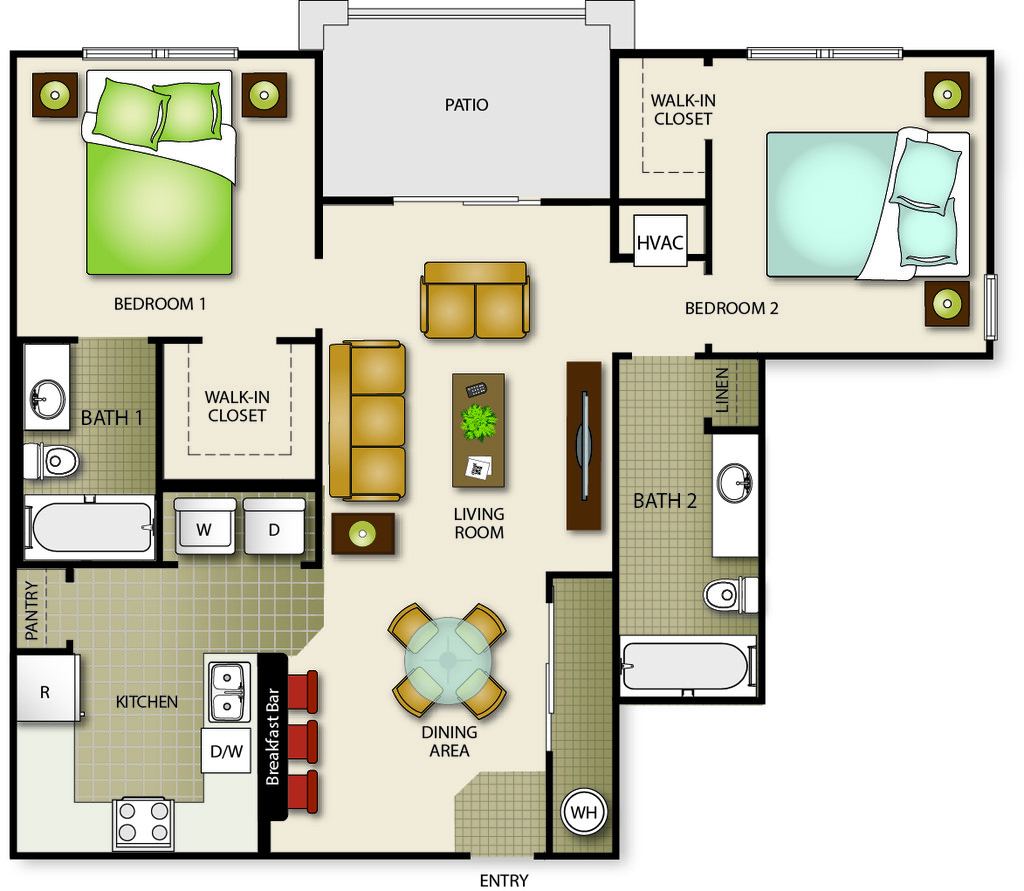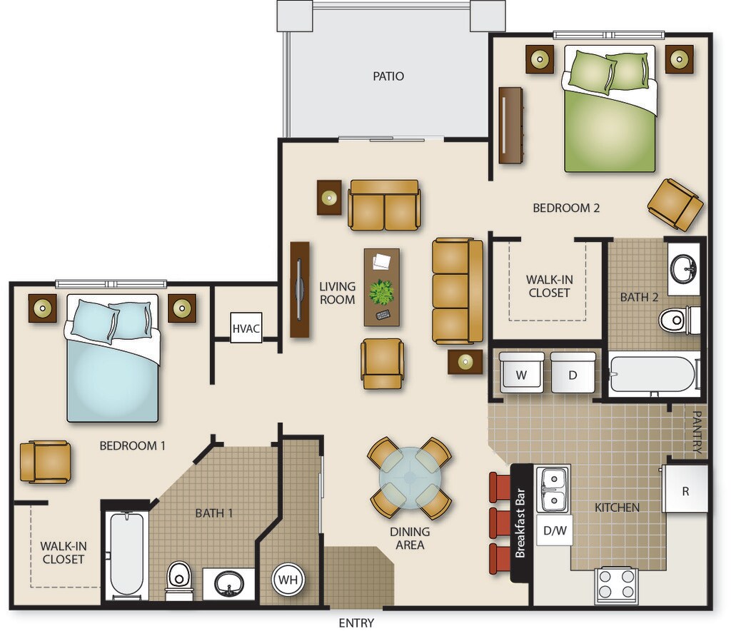Modelo de apartamento: Highland$1,4932 Dormitorios, 2 Baños, 941 sq ftDisponible Ahora![]()
