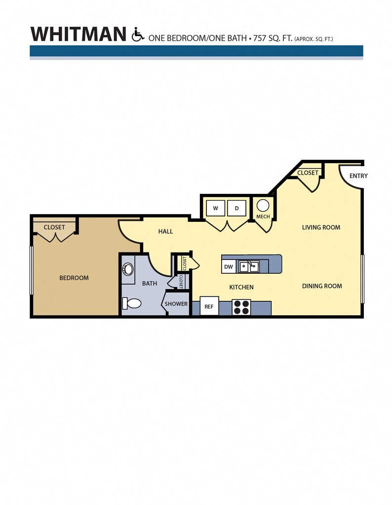 Modelo de apartamento: Whitman HCA1 Dormitorio, 1 Baño, 757 sq ftNo DisponibleWhitman HCA - Plano 1 Alcott